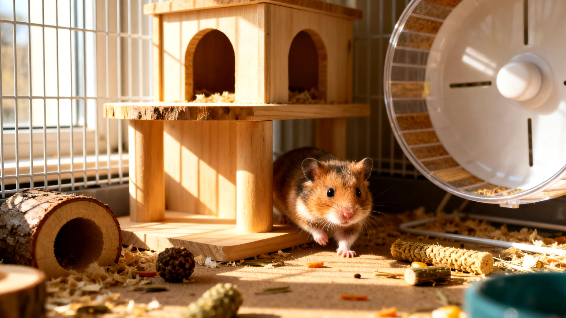 Ein abgedunkelter, ruhiger Schlafbereich ist dabei genauso wichtig wie die Aktivitätszonen. Mehrere Häuschen mit mindestens zwei Ausgängen – damit der Hamster sich nicht in die Enge getrieben fühlt – sollten zur Verfügung stehen. Diese Struktur entspricht den natürlichen Bauten mit mehreren Fluchtwegen und separaten Kammern.